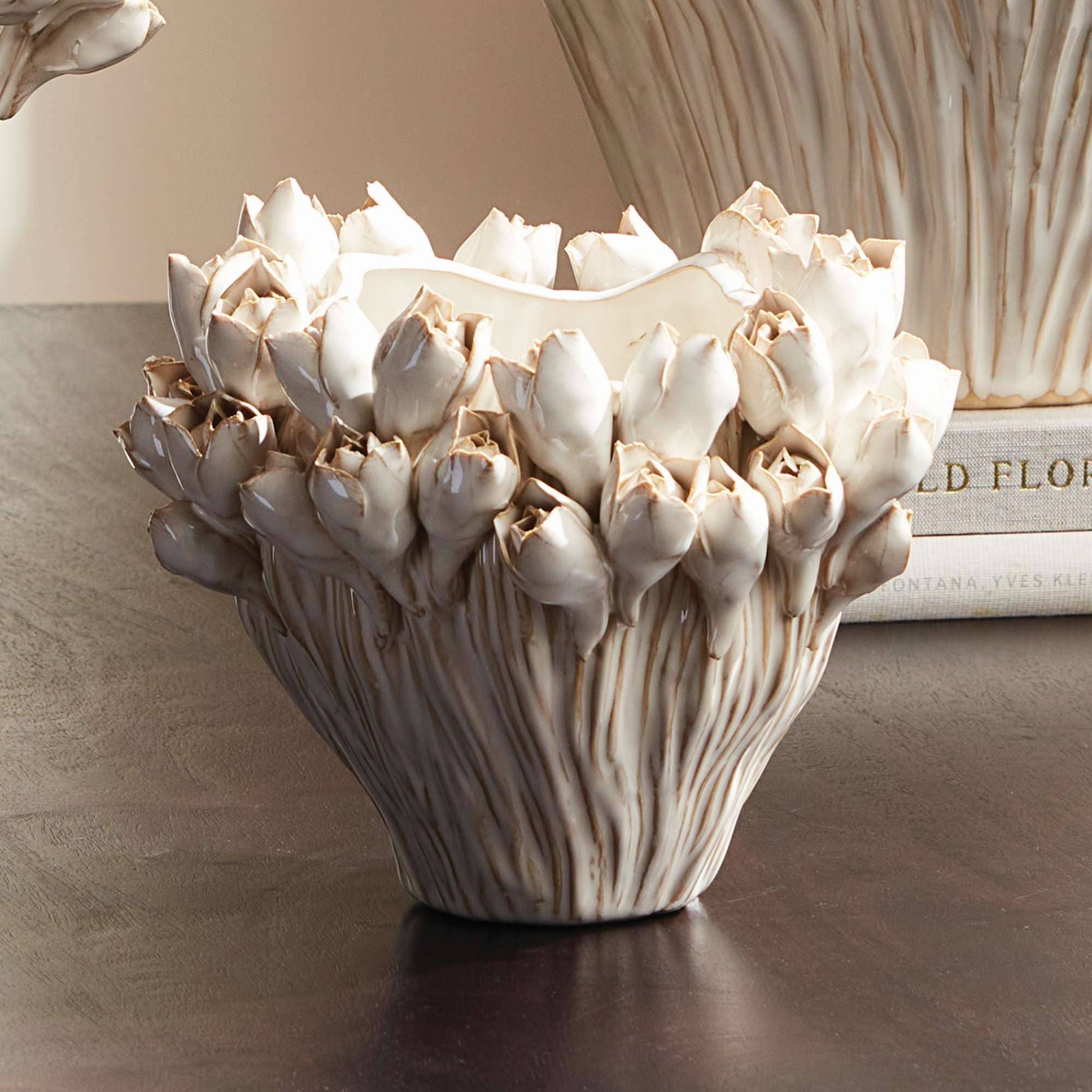 The Courtney Vase Short in Antique White Ceramic is an essential piece for interior designers and specialty retailers looking to offer clients a distinctive decorative item. This stunning vase showcases a multi-floral design with hand-applied sculpted buds, ensuring each piece is unique. Its dynamic reactive glaze and brushed antique finish add depth and character, making it a striking focal point in any setting.